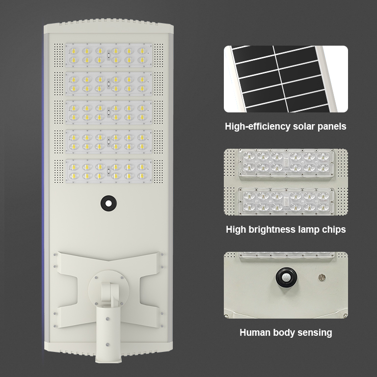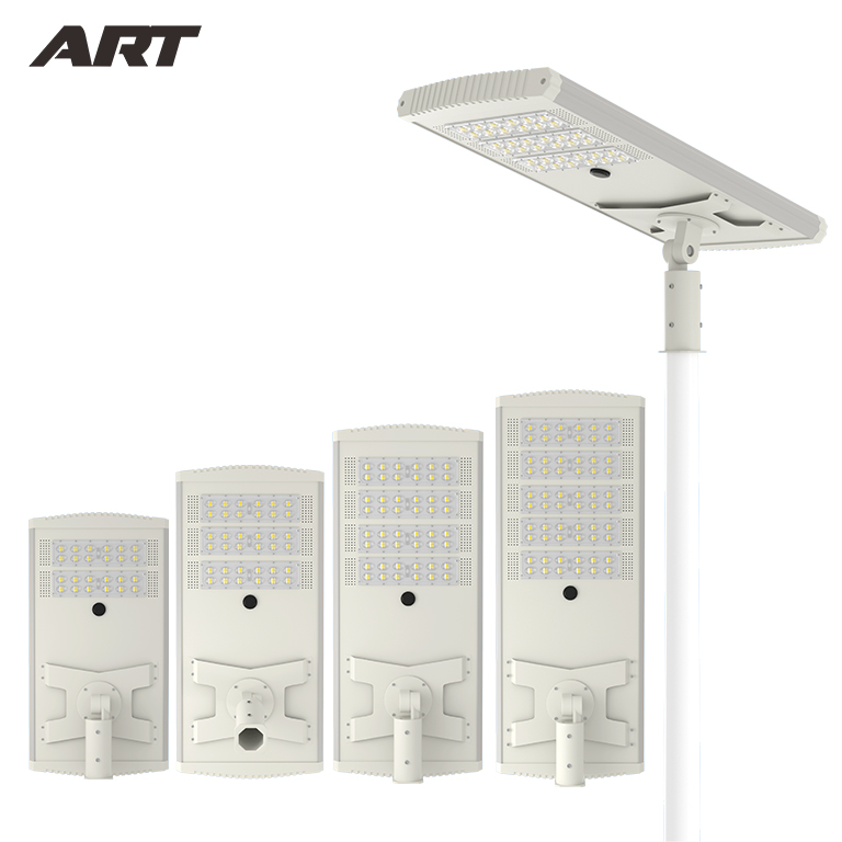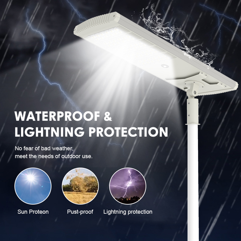 Street light uses solar power to store electricity in lithium batteries during the day and supplies the electricity from the lithium batteries to LEDights at night. The all in one solar light can light for 12 hours at night,and support on rainy and snowy days. it canprovide brightness for 6-8 days or rainy days.